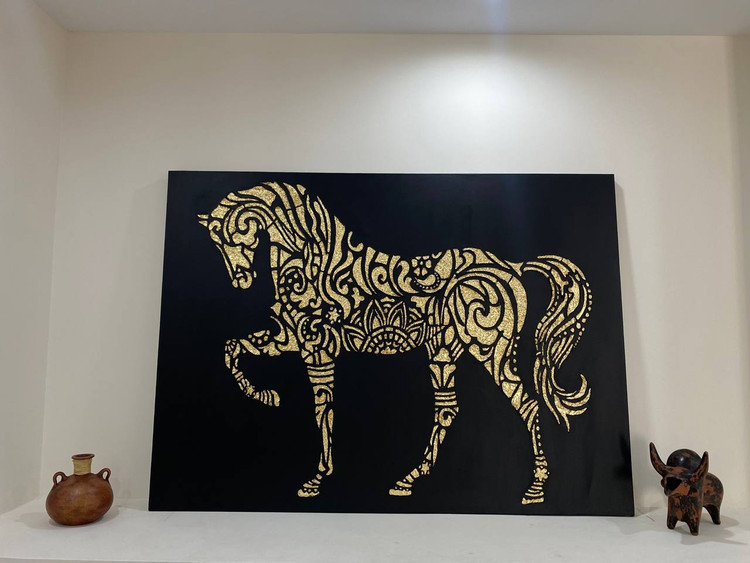 تابلو دکوراتیو اسب طلایی مدل برجسته اجرا شده است مناسب دیوار های نشیمن ، در دکوراسیون منزل و در دکوراسیون محیط کار اسب در فنگ شویی نماد خوشبختی و ثروت هست .