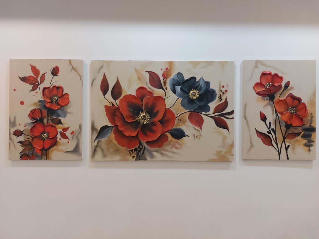 تابلوهای سه تکه امروزه بسیار مناسب برای پر کردن دیوار های بزرگ و خالی منزل شما این تابلوی زیبا با کلهای قرمز و جذاب انرژی و نشاط را برای شما به ارمغان می آورد.