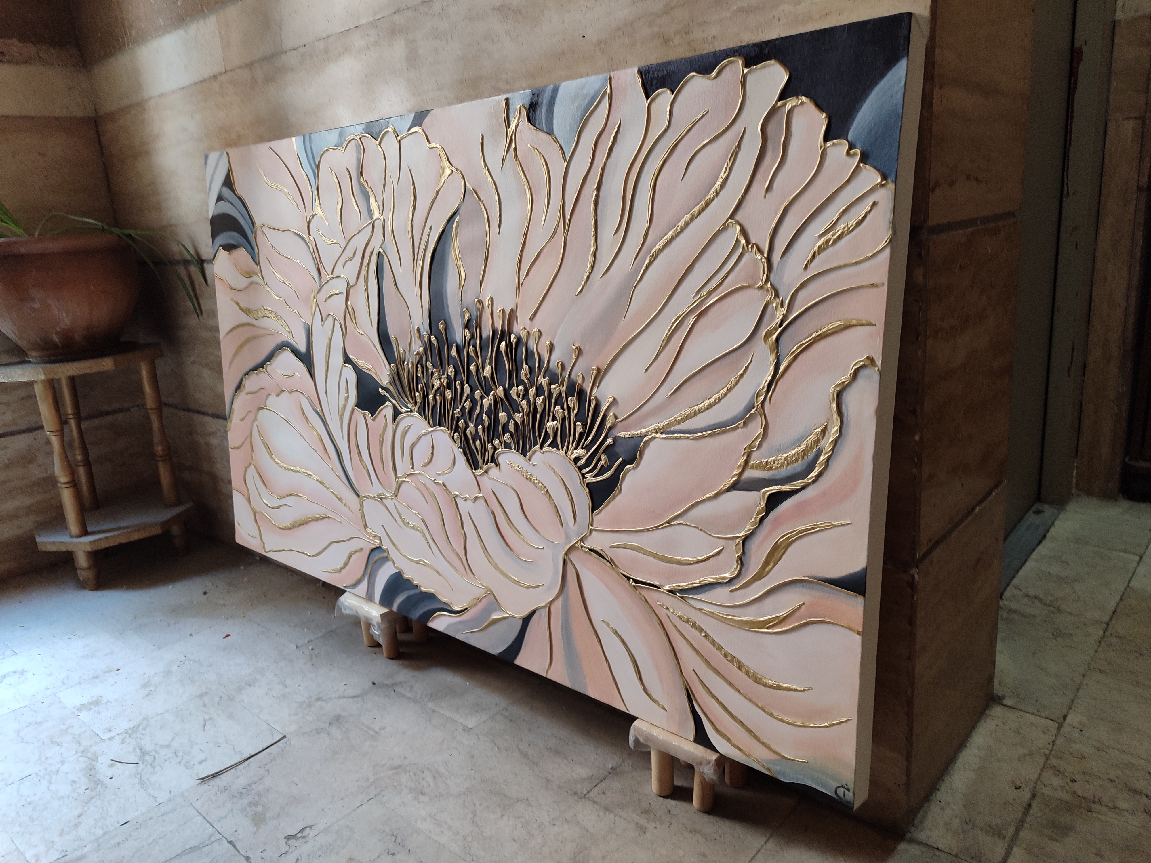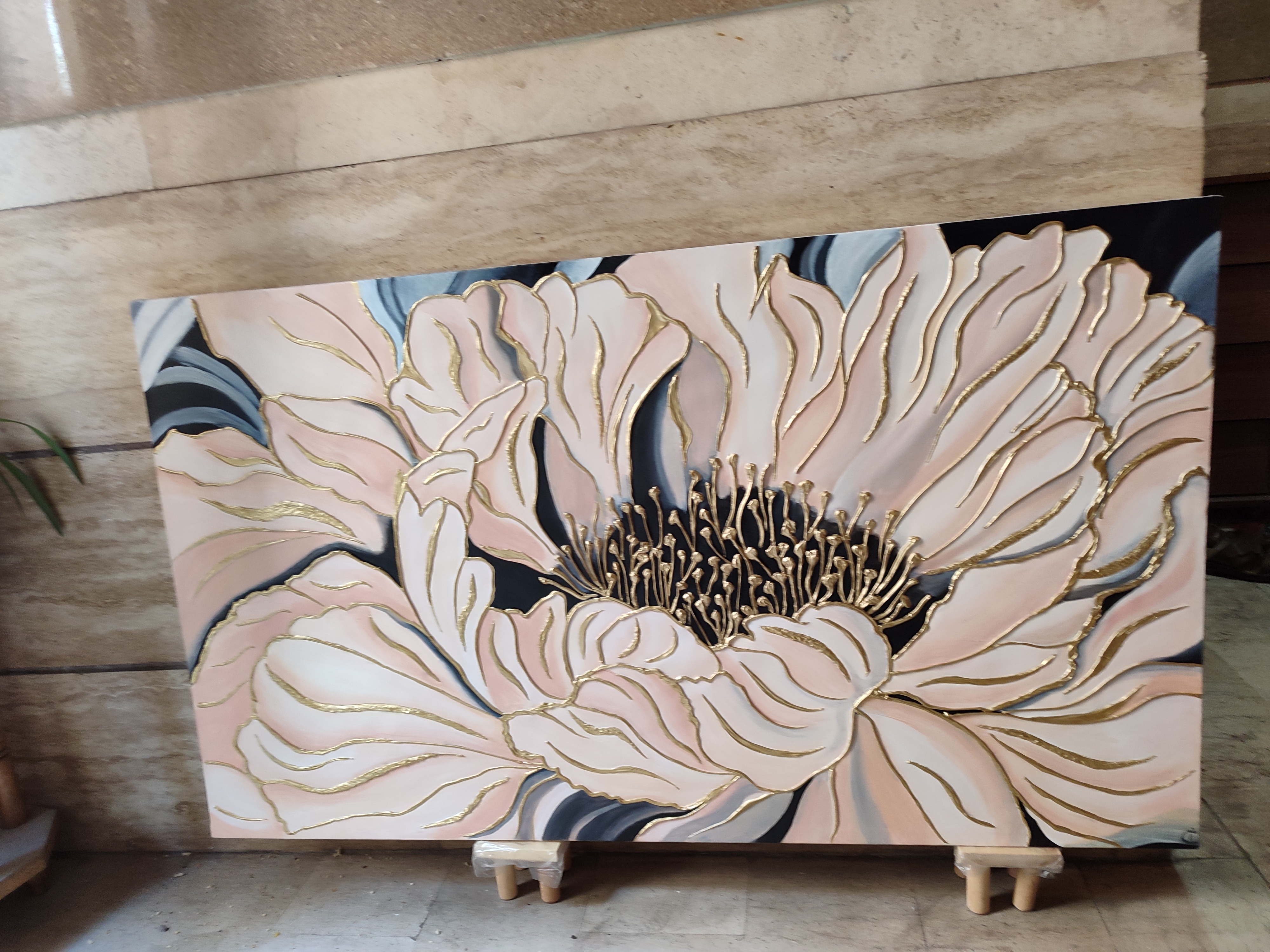 در سایز ۷۰ در ۱۲۰ اجرا شده بسیار زیبا و شکیل هست به خصوص برای سالن منزل رنگهای خنثی و متمایل به گرم تابلو باعث شده تا بسیار به محیط انرژی بخش باشد