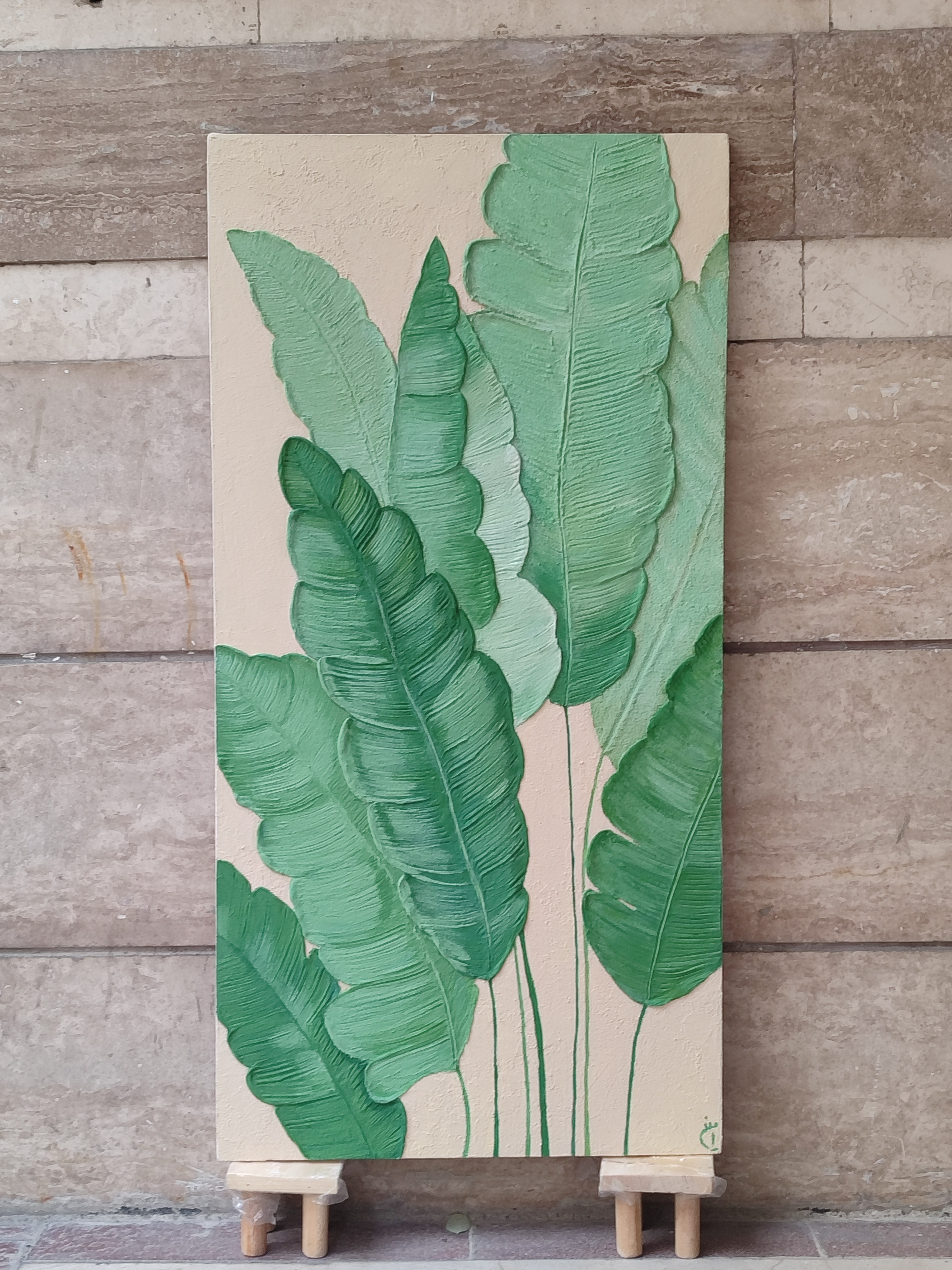 تابلو برگ موز این روزها بسیار ترند در رنگهای برگ سبز با برگ طلایی ویا برگهای سیاه در مدلهای مختلف درست می شوند
