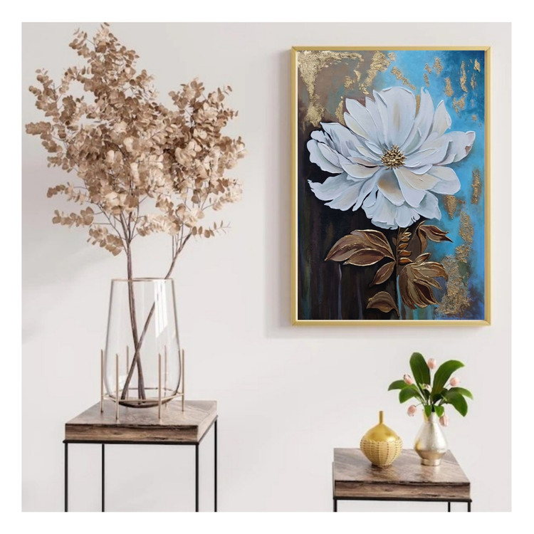 تابلوی دکوراتیو گل سفید با رنگ زمینه ی کرم قهوه ایی مشکی و آبی به صورت برجسته اجرا شده