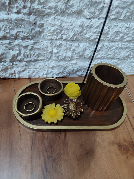 یه عدد گلدان متوسط یه عدد جا عودی طرح گل و دو عدد شمعدان به همراه دو عدد گل شمعی هستند